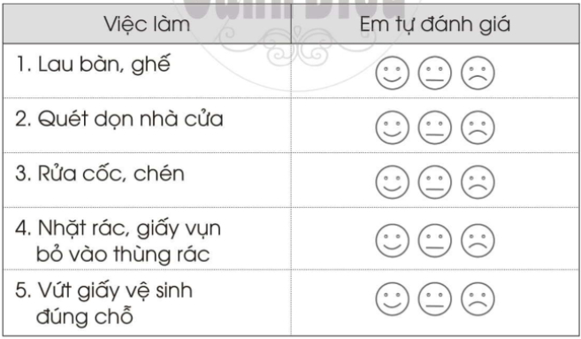 Nối hình với ô chữ về việc làm để giữ sạch nhà ở cho phù hợp. Viết một số việc mà các thành viên trong gia đình em đã làm để giữ sạch nhà ở. Viết số 1, 2, 3 vào ô trống theo thứ tự các bước quét nhà và lau bàn. Với các việc dưới đây, em hãy tô màu vào: mặt cười nếu em thường xuyên làm, mặt bình thường nếu em thỉnh thoảng làm, mặt mếu nếu em ít khi làm.