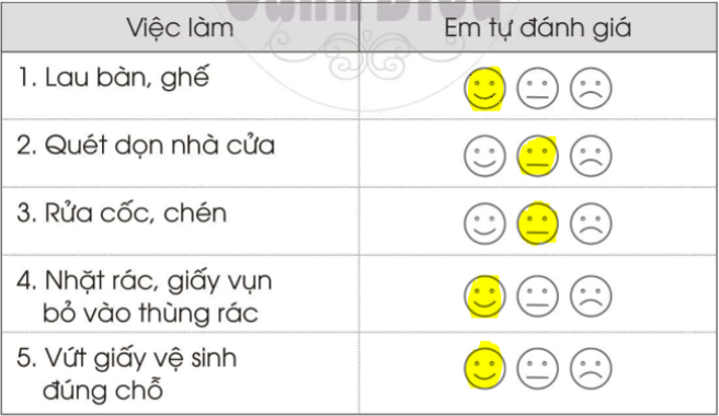 Với các việc dưới đây, em hãy tô màu vào: mặt cười nếu em thường xuyên làm, mặt bình thường nếu em thỉnh thoảng làm, mặt mếu nếu em ít khi làm.