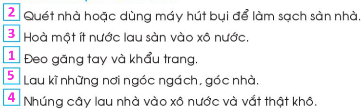 Điền số từ 1 đến 5 vào ô trống tương ứng với thứ tự các bước lau sàn nhà sạch và an toàn.