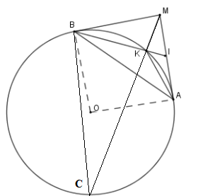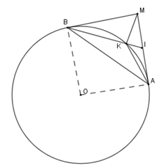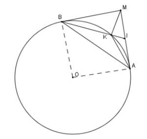 Cho đường tròn $(O;R)$ với $A$ là điểm cố định trên đường tròn. Kẻ tiếp tuyến $Ax$ với $(O)$ và lấy $M$ là điểm bất kì thuộc tia $Ax$. Vẽ tiếp tuyến thứ hai $MB$ với đường tròn $(O)$. Gọi $I$ là trung điểm $MA$, $K$ là giao điểm của $BI$ với $(O)$.