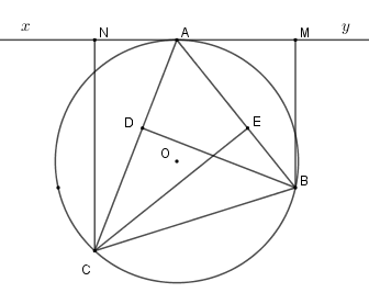 Cho tam giác nhọn \(ABC\) \(\left( {AB < AC} \right)\) nội tiếp \(\left( {O;R} \right)\) . Gọi \(BD;CE\) là hai đường cao của tam giác. Gọi \(d\) là tiếp tuyến tại \(A\) của \(\left( {O;R} \right)\)  và \(M,N\) lần lượt là hình chiếu của \(B,C\) trên \(d\) .