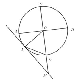 \(\begin{array}{l} \Rightarrow \widehat {CIM} = \dfrac{1}{2}\widehat {IOC} \Rightarrow \widehat {IOC} = 2\widehat {CIM} = {2.30^0} = {60^0}\\ \Rightarrow \widehat {IOA} = {90^0} – {60^0} = {30^0}\end{array}\)