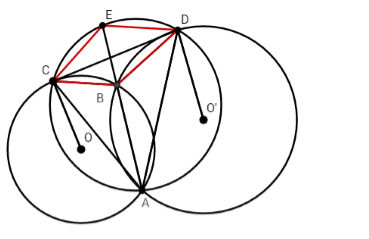 Cho hai đường tròn $\left( O \right)$  và $\left( {O’} \right)$  cắt nhau tại $A$ và $B$. Một đường thẳng tiếp xúc với $\left( O \right)$  tại $C$, và tiếp xúc với đường tròn $\left( {O’} \right)$  tại $D$ sao cho tia \(AB\) cắt đoạn \(CD\). Vẽ đường tròn $\left( I \right)$  đi qua ba điểm $A,C,D$ cắt đường thẳng $AB$ tại  một điểm thứ hai là $E$. Chọn câu đúng: