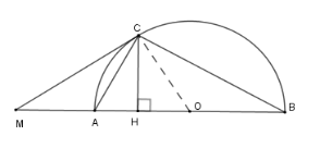 Cho nửa đường tròn \(\left( O \right)\) đường kính \(AB\) . Trên tia đối của tia \(AB\)  lấy điểm \(M\) . Vẽ tiếp tuyến \(MC\) với nửa đường tròn. Gọi \(H\) là hình chiếu của \(C\) trên \(AB\) .