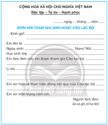 Hoàn thành Đơn xin tham gia sinh hoạt câu lạc bộ theo mẫu dưới đây: