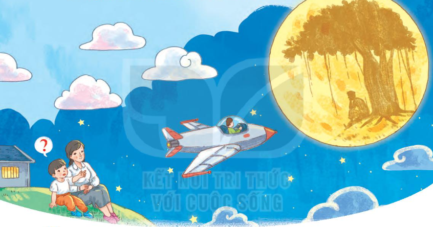a. Trong tranh, em nhìn thấy mây, bầu trời đêm, thấy người lái máy bay, thấy mặt trăng có chú Cuội ngồi dưới gốc cây đa.