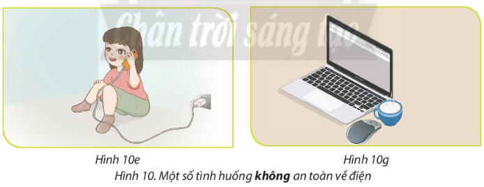 Các hình dưới đây là những tình huống sử dụng máy tính không an toàn, dễ bị tai nạn về điện. Em hãy ghép câu nhắc nhở an toàn về điện phù hợp với mỗi tình huống trong hình (sử dụng các gợi ý trong khung).