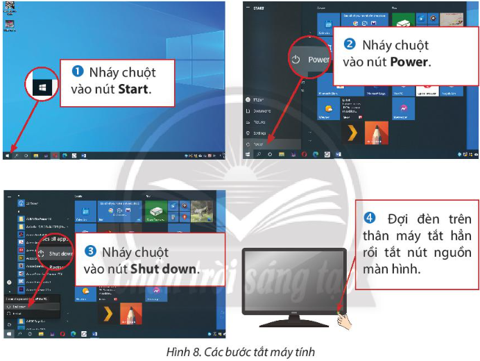 Quan sát hình 8 để nêu các thao tác tắt máy tính.