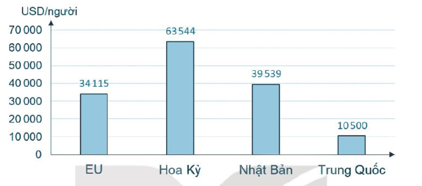 Dựa vào biểu đồ cột đã cho, quan sát lần lượt 4 cột thể hiện GDP/người của 4 trung tâm kinh tế lớn trên thế giới năm 2020 để tiến hành so sánh và rút ra nhận xét.