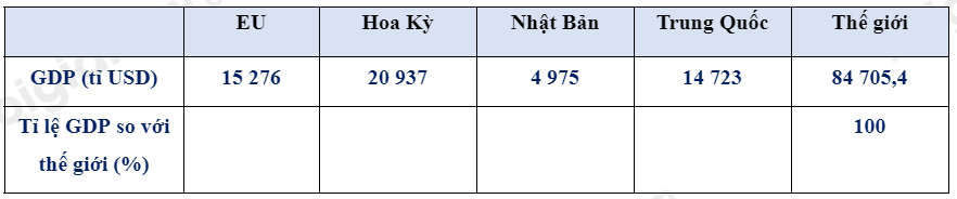 Quan sát bảng số liệu đề bài cho, áp dụng công thức để tính được tỉ lệ GDP của các trung tâm kinh tế lớn so với thế giới (%).