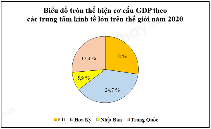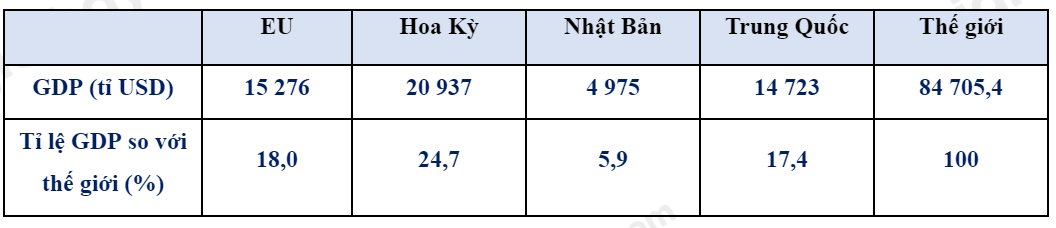 Từ bảng số liệu, ta thấy GDP của EU đứng thứ hai trong bốn trung tâm kinh tế lớn trên thế giới, đạt 15 276 tỉ USD (năm 2020)