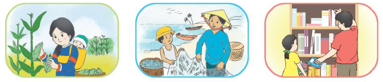 Tranh 2: Bạn nhỏ đang đi kéo lưới cùng mẹ