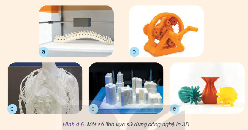 Quan sát hình 4.6 và nêu tên của một số lĩnh vực in 3D