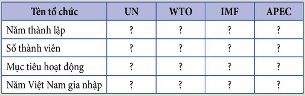 Hoàn thành bảng theo mẫu sau về các tổ chức UN, WTO, IMF, APEC