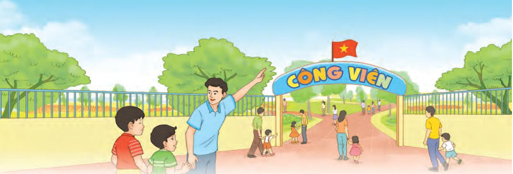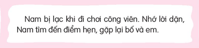 Sáng Chủ nhật, bố cho Nam và em đi công viên. Công viên đông như hội. Khi vào cổng, bố dặn: “Các con cẩn thận kẻo bị lạc. Nếu không may bị lạc, các con nhớ đi ra cổng này. Nhìn kìa, trên cổng có lá cờ rất to.”