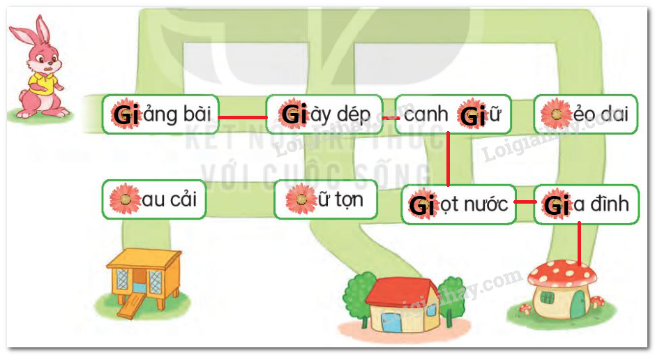 Đường về nhà thỏ phải đi qua những từ ngữ có bông hoa cần thay bằng gi. Em hãy giúp thỏ tìm đường về nhà nhé.