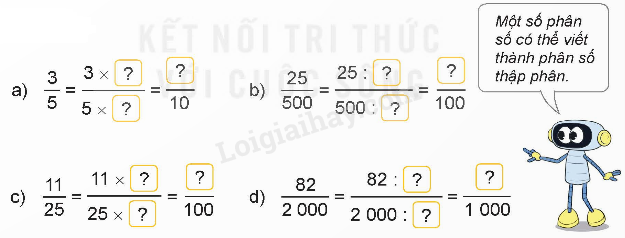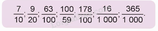 Nhân hoặc chia cả tử số và mẫu số của các phân số đã cho với một số thích hợp để được phân số có mẫu số là 10; 100; 1 000, …