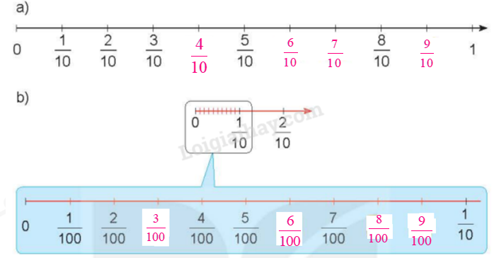 a) Đếm thêm $\frac{1}{{100}}$ rồi viết phân số thập phân thích hợp.