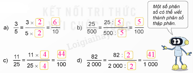 Nhân hoặc chia cả tử số và mẫu số của các phân số đã cho với một số thích hợp để được phân số thập phân có mẫu số là 10; 100; 1 000.