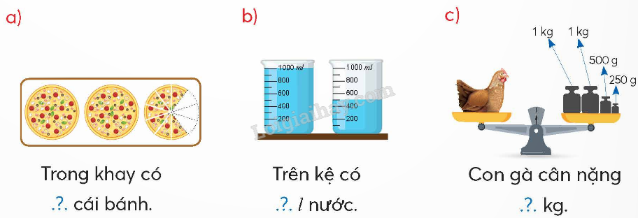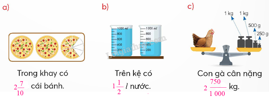 Quan sát hình vẽ để viết hỗn số thích hợp với mỗi hình.