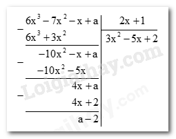 Để \(6{x^3} – 7{x^2} – x + a\) chia \(2x + 1\) dư \(2\)  thì \(a – 2 = 2 \Leftrightarrow a = 4\).