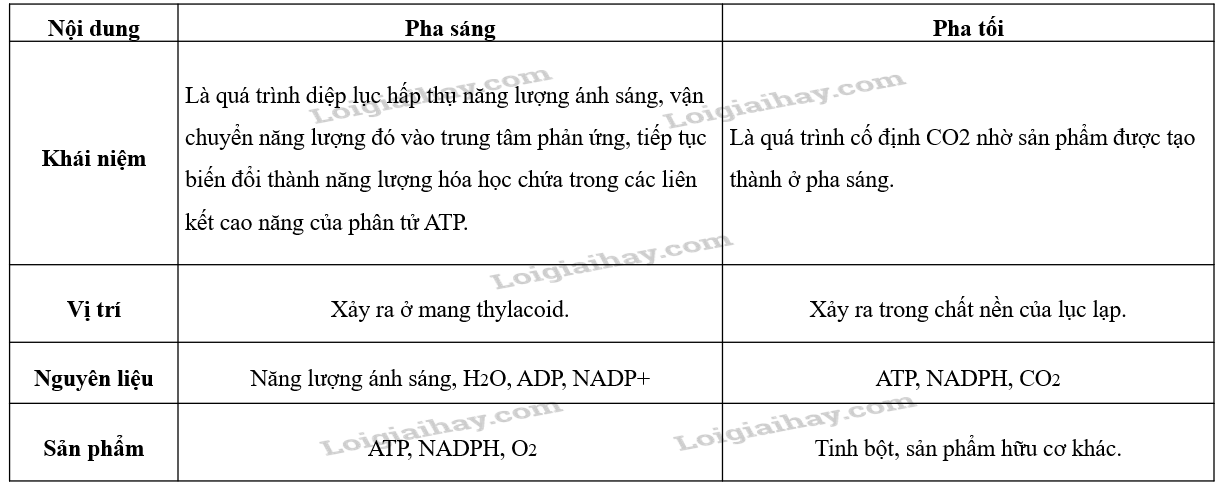Quá trình quang hợp gồm những pha nào? Nguyên liệu và sản phẩm của mỗi pha là gì?