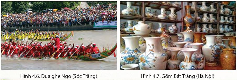 B3: Quan sát hình 4.6 và hình 4.7 qua đó ta thấy được lễ hội đua ghe Ngo nước của người Khơ-me và các sản phẩm gốm của làng nghề gốm Bát Tràng ở Hà Nội.
