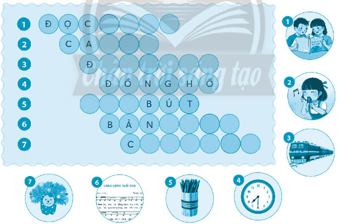 Em đọc kĩ, quan sát những gợi ý ở từng bức tranh được đánh số và tìm từ ngữ có số lượng chữ cái phù hợp với ô chữ.