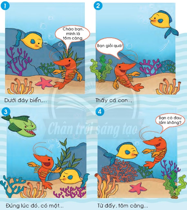 Tranh 1: Dưới đáy biển, Tôm Càng nhìn thấy một con vật lạ với thân dẹt, trên đầu có hai mắt tròn xoe, khắp người phủ một lớp vẩy bạc óng ánh. Con vật đó chính là Cá Con.