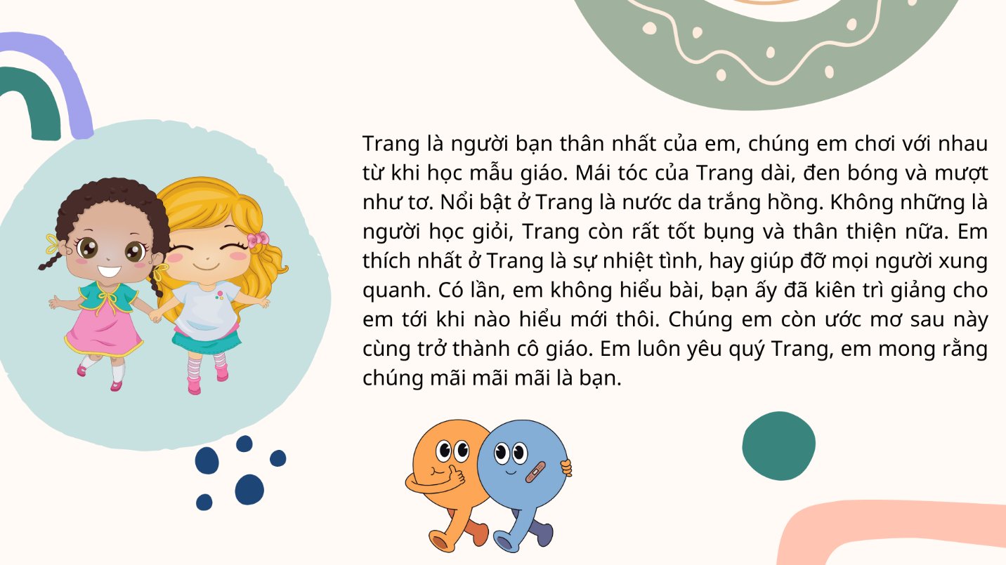 Trang là người bạn thân nhất của em, chúng em chơi với nhau từ khi học mẫu giáo. Mái tóc của Trang dài, đen bóng và mượt như tơ. Nổi bật ở Trang là nước da trắng hồng. Không những là một người học giỏi, Trang còn rất tốt bụng và thân thiện nữa. Em thích nhất ở Trang là sự nhiệt tình, hay giúp đỡ mọi người xung quanh. Có lần, em không hiểu bài, bạn ấy đã kiên trì giảng cho em tới khi nào hiểu mới thôi. Chúng em còn ước mơ sau này cùng trở thành cô giáo. Em luôn yêu quý Trang, em mong rằng chúng mãi mãi mãi là bạn.
