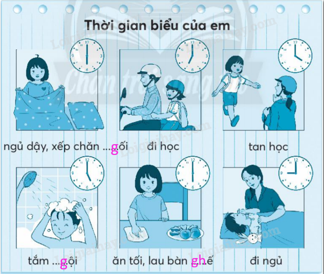 Nhìn – viết: Ngày hôm qua đâu rồi? Điền chữ cái thích hợp vào chỗ trống. Điền chữ g hoặc chữ gh vào chỗ trống. Viết 3 từ ngữ có tiếng sách, tiếng học. Viết 1 – 2 câu có từ ngữ ở bài tập 4. Lập thời gian biểu một buổi trong ngày của em. Trang trí thời gian biểu. Viết vào Phiếu đọc sách những điều em đã chia sẻ với bạn sau khi đọc một bài đọc về trẻ em.