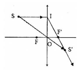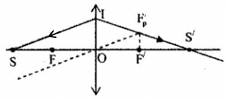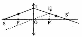 + Tia tới song song với trục phụ thì tia ló qua tiêu điểm phụ nên tia ló qua \(I\) và \({F_p}’\), tia ló này cắt trục chính tại \(S’\). \(S’\) là ảnh cần xác định.