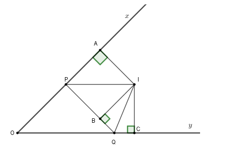 Gọi I là giao điểm các tia phân giác của \(\widehat {xPQ};\,\widehat {yQP}\) và A, B, C lần lượt là hình chiếu của I lên Ox, PQ và Oy.