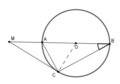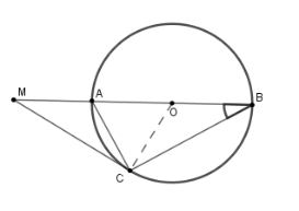 Cho đường tròn $(O;R)$ đường kính $AB$. Vẽ dây $AC$ sao cho \(\widehat {ABC} = 30^\circ \) . Trên tia đối của tia $AB$ lấy điểm $M$ sao cho $AM = R$ .