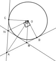 Từ một điểm $A$ ở bên ngoài đường tròn $\left( {O;R} \right)$,vẽ hai tiếp tuyến $AB,AC$ với $\left( O \right)$. Đường thẳng vuông góc với $OB$ tại $O$ cắt tia $AC$ tại $N$. Đường thẳng vuông góc với $OC$ tại $O$ cắt tia $AB$ tại $M$.