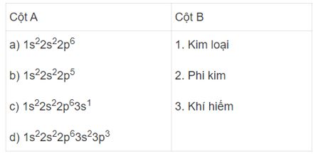 Nối mỗi cấu hình electron của nguyên tử ở cột A với các loại nguyên tố hóa học thích hợp ở cột B.