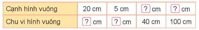 – Cạnh hình vuông có chu vi 100 cm là 100 : 4 = 25 (cm)