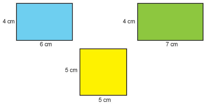 Mai, Nam và Việt cắt được ba tờ giấy màu có kích thước như hình vẽ dưới đây. Biết tờ giấy màu của Nam có chu vi bằng tờ giấy màu của Việt nhưng có diện tích bé hơn. Em hãy xác định tờ giấy màu mà mỗi bạn đã cắt được.