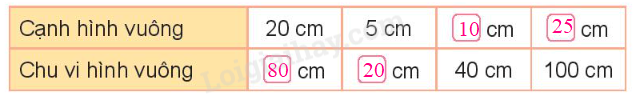 – Cạnh hình vuông có chu vi 100 cm là 100 : 4 = 25 (cm)