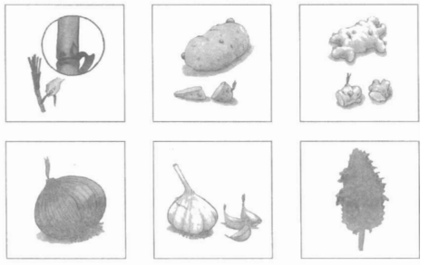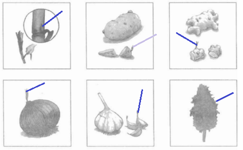 Giải câu 1, 2 Bài 54: Cây con có thể mọc lên từ một số bộ phận của cây mẹ trang 91, 92 VBT Khoa học 5. Câu 2: Sử dụng mũi tên để chỉ vào chồi trong các hình sau
