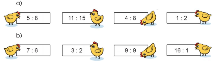 a) 7 : 6 = $\frac{7}{6}$     ;     3 : 2 = $\frac{3}{2}$                                                                            $9:9 = \frac{9}{9}$   ;    $16:1 = \frac{{16}}{1}$