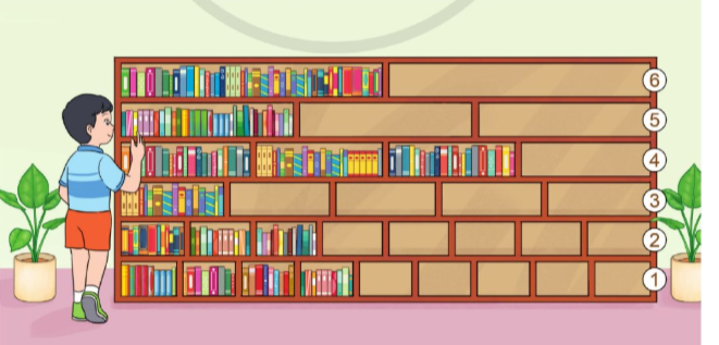 Nêu phân số chỉ số phần đã xếp đầy sách trong mỗi hàng của giá sách dưới đây: