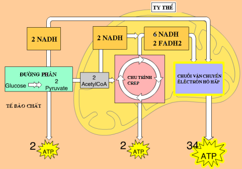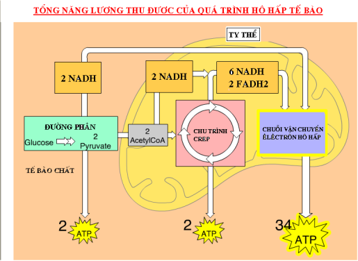 Chuỗi chuyền electron chỉ tạo ra 34 ATP, còn toàn bộ hô hấp nội bào tạo 38 ATP (Đường phân tạo 2 ATP, chu trình crep 2 ATP)