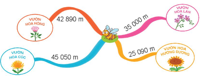 Vậy từ vị trí ong vàng đến vườn hoa cúc là xa nhất; Từ vị trí ong vàng đến vườn hoa hướng dương là gần nhất.