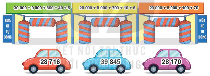 Mỗi ô tô sẽ đến chỗ rửa xe ghi biểu thức có giá trị là số ghi trên ô tô đó. Tìm chỗ rửa cho mỗi ô tô.