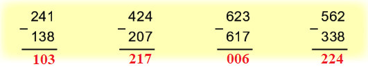 – Tính : Từ phải qua trái, lần lượt trừ hai số đơn vị, hai số chục và hai số trăm. Lưu ý trường hợp phép trừ có nhớ dạng mượn 1 chục.