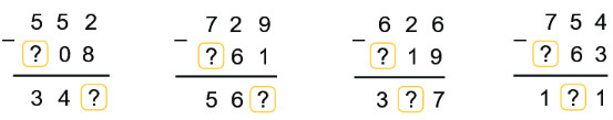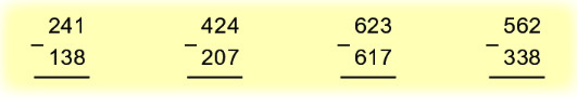 \(\begin{array}{*{20}{c}}{ – \begin{array}{*{20}{c}}{762}\\{\,\,\,70}\end{array}}\\\hline{\,\,\,\,692}\end{array}\)                       \(\begin{array}{*{20}{c}}{ – \begin{array}{*{20}{c}}{529}\\{130}\end{array}}\\\hline{\,\,\,\,399}\end{array}\)                       \(\begin{array}{*{20}{c}}{ – \begin{array}{*{20}{c}}{430}\\{\,\,\,50}\end{array}}\\\hline{\,\,\,\,380}\end{array}\)