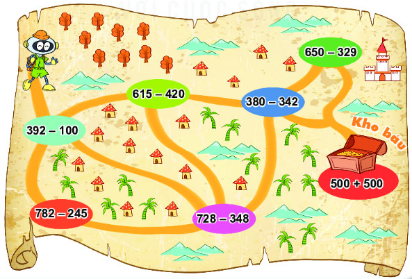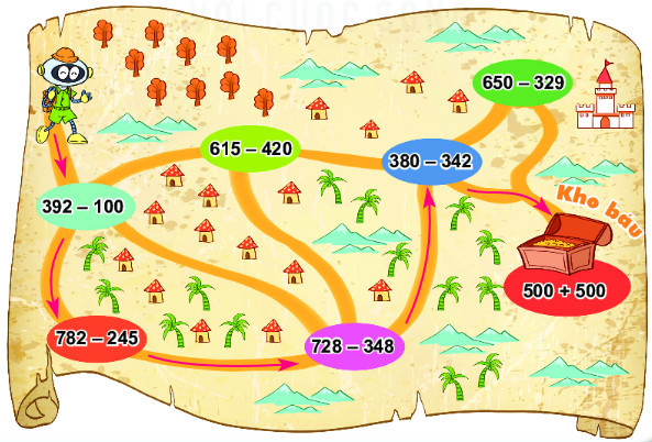 Tính kết quả các phép tính được ghi trên bản đồ, sau đó dựa vào thứ tự các số trên chỉ dẫn để tìm ra đường Rô-bốt đã đi.