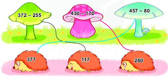 Thực hiện phép tính ghi trên mỗi cây nấm, sau đó đối chiếu kết quả với kết quả ghi trên mỗi chú nhím để tìm cây nấm cho mỗi bạn nhím.
