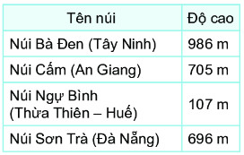 Biết độ cao của một số núi ở Việt Nam như sau: